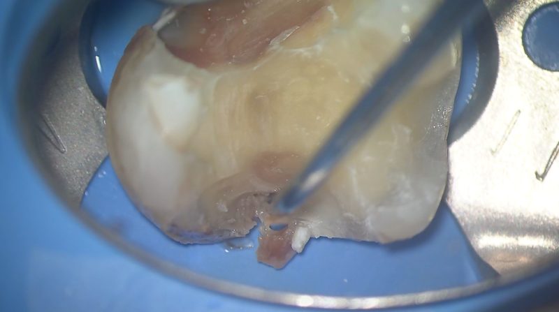 修復物の近心側を削除していくと、大きな虫歯が出てきました。